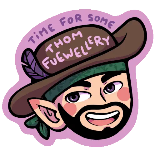 Thom Fuewellery, known as Tomfoolery, a Ren Faire bard, playing a string instrument in an animated sticker.