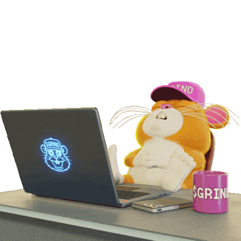a stuffed animal is sitting in front of a laptop and a mug that says grind on it