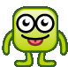 A happy, pixelated green Bricci character wiggles its tongue and blinks, showing a playful expression.