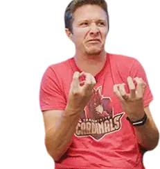 Brian Lagerstrom makes a disgusted face, sticking his tongue out while wearing a blue shirt and suspenders.