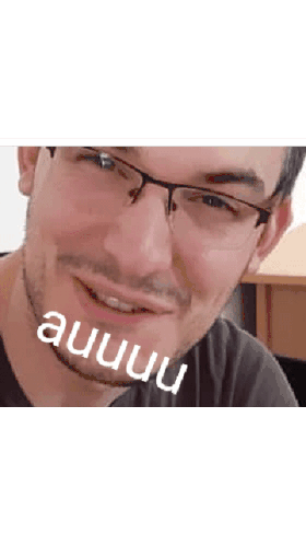 a man with glasses and a beard is smiling with the word auuu written on his face .