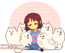 Frisk from Undertale sits happily, surrounded by many adorable Annoying Dogs in a charming pixel art style.