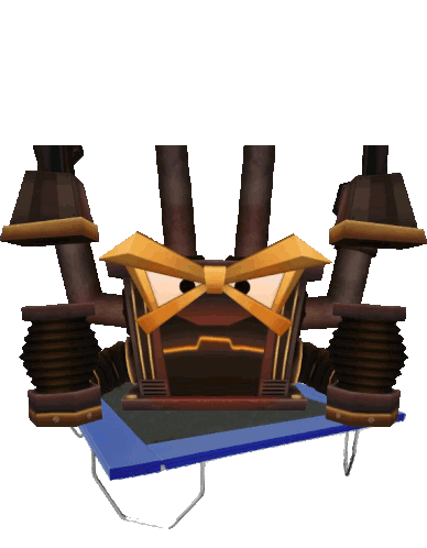 A Toontown Rewritten Boiler, a large cartoon robot, hovers above a blue trampoline, ready for action.