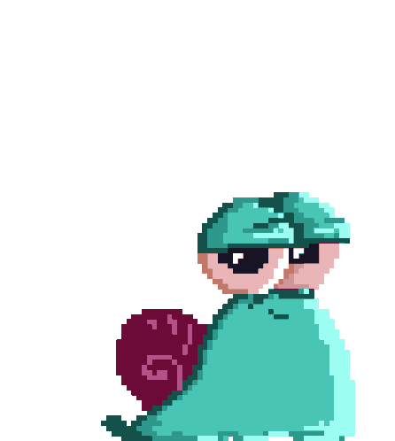 Topalsalyangoz Salyo, the pixel art snail, appears with large, tired eyes and a teal body, moving subtly.