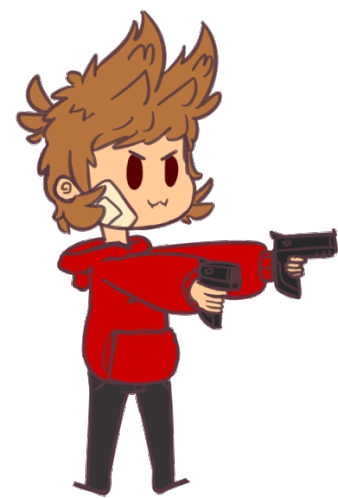 Tord from Eddsworld, in his signature red hoodie, dynamically jumping while holding two black guns.