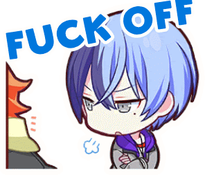 a cartoon of a boy with blue hair and the words fuck off above him