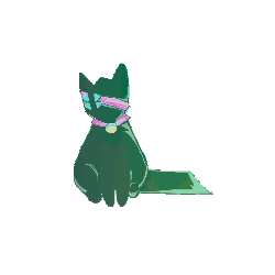 a pixel art drawing of a black cat wearing a pink collar and a yellow bell .