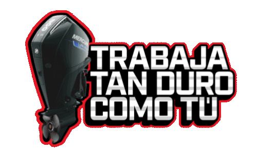 A Mercury Seapro outboard motor with the motivational Spanish slogan 'Trabaja Tan Duro Como Tú' (Work As Hard As You).