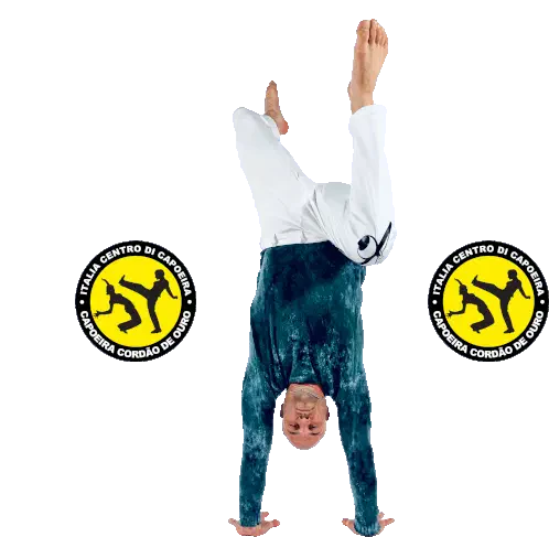 A dynamic logo for Capoeira Cordão de Ouro Italia, featuring two practitioners in action within a circular design.