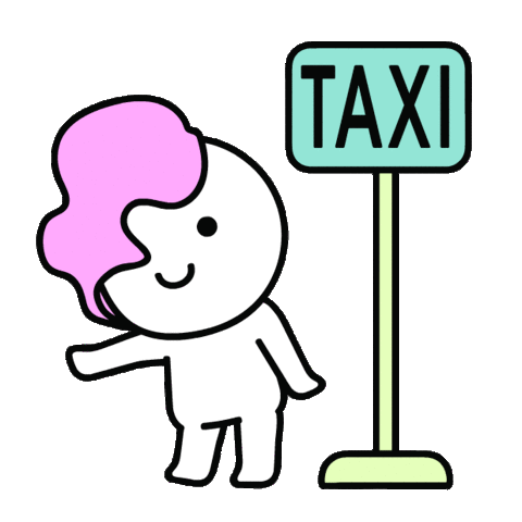 A cute cartoon character with pink hair waves to hail a taxi next to a 'TAXI' sign.