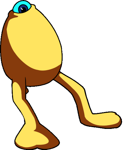 a cartoon drawing of a yellow egg with a blue eye and long legs