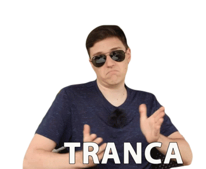A man in sunglasses gives a thumbs-up, looking confident and chill, with the Portuguese slang 'TRANCA'.