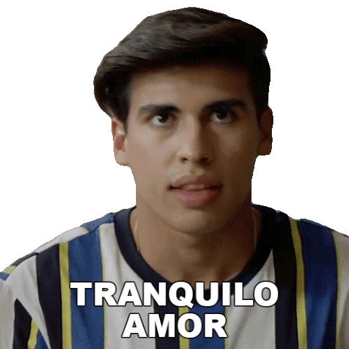 A young man in a blue and white striped shirt says 'Tranquilo Amor' (Calm down, love) with a serious expression.