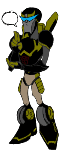 Prowl, the Transformers robot, is animated in a cartoon style, gesturing with a speech bubble.