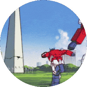 Optimus Prime from Transformers G1 runs past the Washington Monument, which appears to be falling due to an animation error.