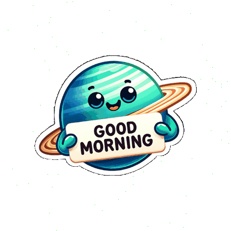 Adorable animated sticker of a cartoon planet with rings, happily holding a sign that reads 'Good Morning'.