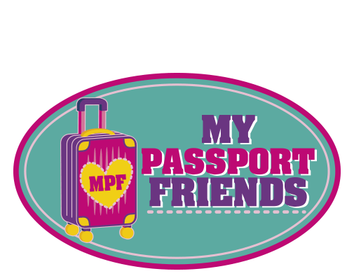 An animated sticker featuring the 'My Passport Friends' logo with a pink suitcase, yellow heart, and sparkling stars.
