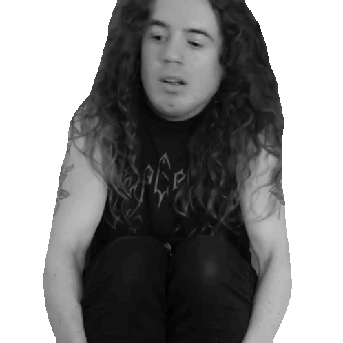 Bradley Hall trembles and shakes, sitting with long curly hair in a black and white scene.