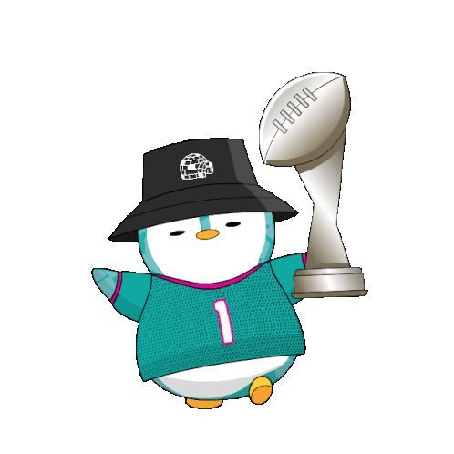 A cute Pudgy Penguin character, dressed in a football jersey and bucket hat, proudly holds a silver championship trophy.