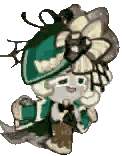 An animated sticker of Truffle Cookie, a charming character in a green hat, jacket, and bow tie, floating playfully.