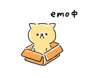 Trumeow, an anxious cat, peeks from a cardboard box with 'emoφ' written above, then hides inside. A cute, emotional sticker.