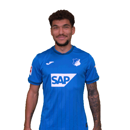 A TSG Hoffenheim player, identified as Valentin Gendrey from the old tags, laughs and smiles in his blue soccer jersey.