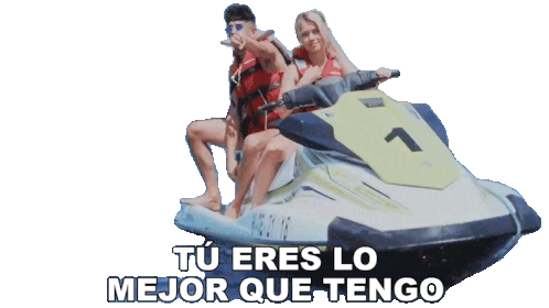 Bejo y una mujer en jet ski, expresando amor con la frase 'Tú eres lo mejor que tengo'. Un momento romántico y divertido.