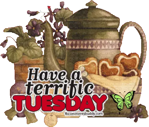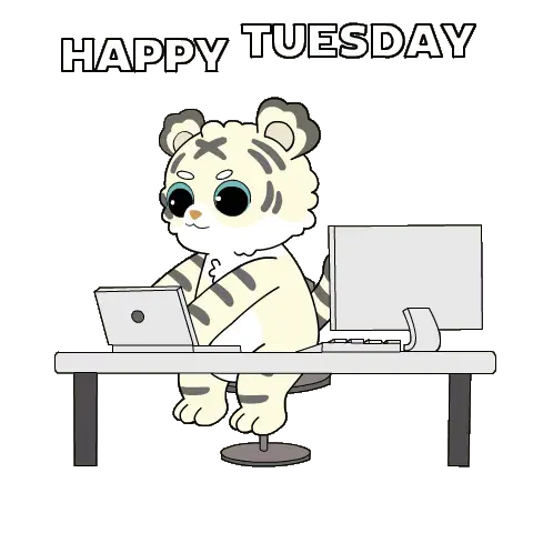 A cute cartoon character, possibly a dog, is focused on drawing or writing on a tablet, with the word 'Tuesday' displayed above.