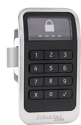 Animation showing a digital keypad lock where a 4-digit code is entered, successfully unlocking the device.