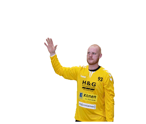 A Tus Haren handball goalkeeper in a yellow jersey makes a dynamic save, blocking a shot with outstretched arm and leg.