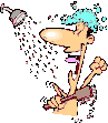 A cartoon man enjoys a refreshing shower, with water spraying from the showerhead. Perfect for 'Bath Time' or 'Clean' themes.