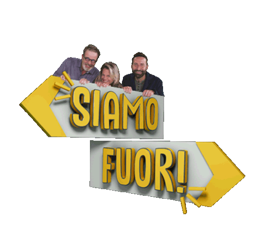 Carlotta Gallino, Christian Frapolli, and Davide Riva appear behind a "Siamo Fuori!" sign, broadcasting live TV.