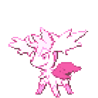 Animated pixel art of a pink and white creature, possibly a Typhlosion, bouncing and flapping its wings.