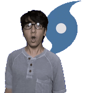 An excited man with glasses reacts, then turns, with a blue Typhoon Damp symbol behind him.