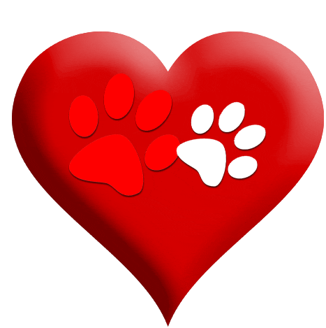 A glossy red heart features two distinct paw prints, one red and one white, symbolizing love for pets.