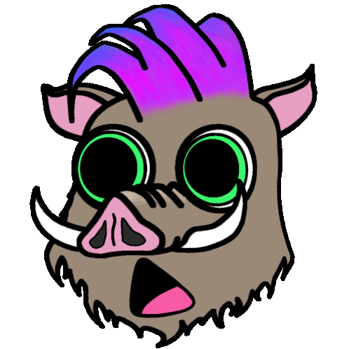 a cartoon drawing of a boar with a purple mohawk and green eyes
