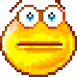 a pixel art smiley face with big eyes and a slight smirk .