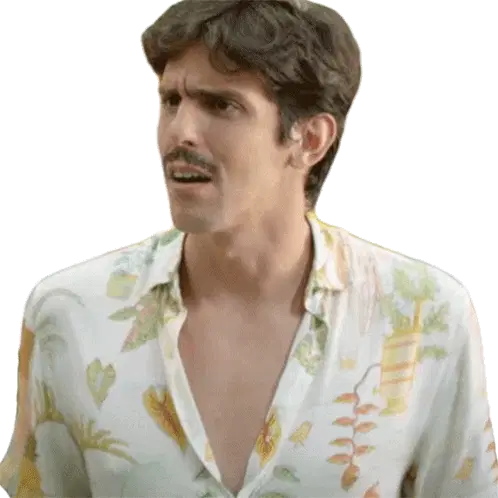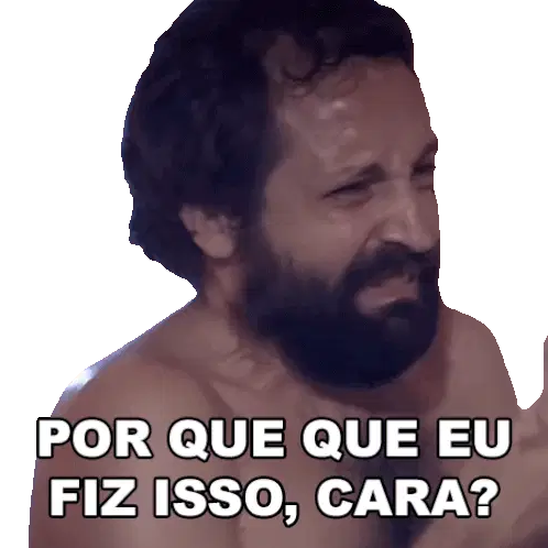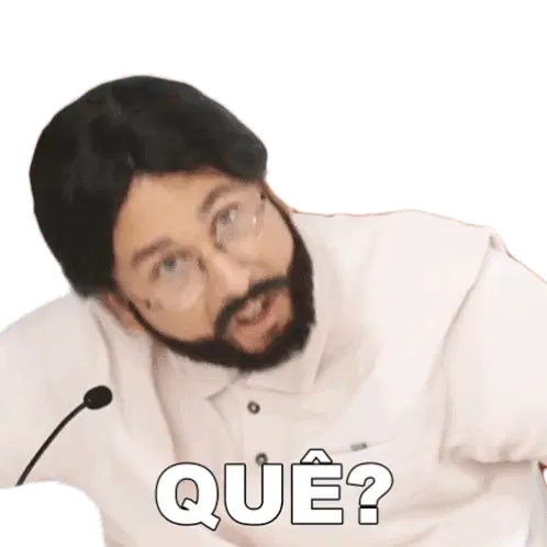Rafael Portugal from Porta dos Fundos, with a questioning look and crossed arms, asking 'Ué?'