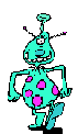 A cheerful pixel art alien with purple spots walks across the screen, featuring a wide smile and antennae.