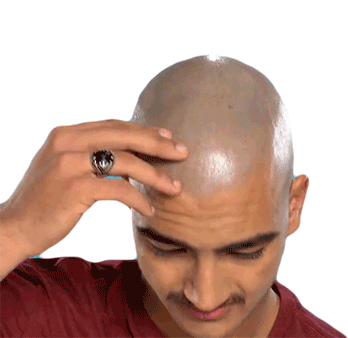 A man rubs his bald head, expressing a feeling of frustration or a headache, then looks up with a slight smile.