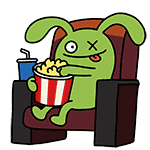 Ugly Dulls, the green one-eyed character, relaxes in an armchair, enjoying popcorn and a refreshing drink.