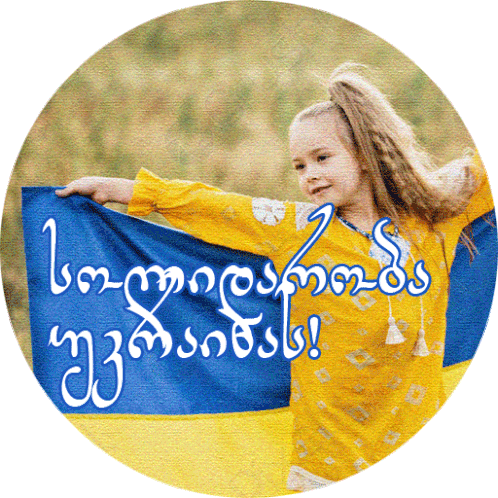 a little girl in a yellow dress holds a blue and yellow flag in front of a sign that says ' ukraine '