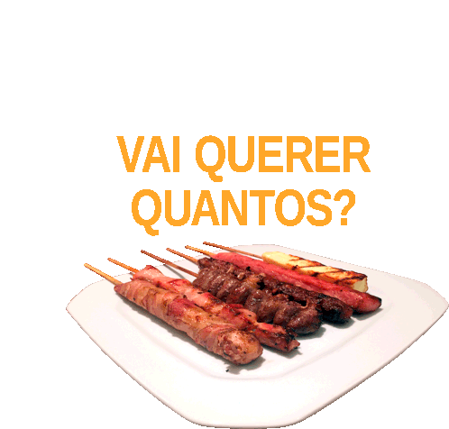 Animated sticker featuring delicious skewers (espetinhos) with the question "Vai Querer Quantos?" (How many do you want?), perfect for Umadecre Assembleia De Deus events.