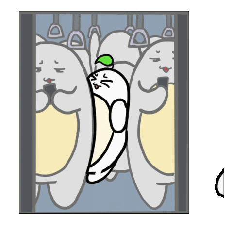 A cheerful, blob-like character with a leaf on its head happily rides an underground public transport train, waving.