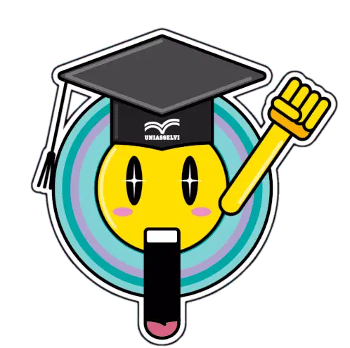 Vibrant Uniasselvi graduation celebration sticker featuring a megaphone-like device, exclamation marks, and energetic colors.