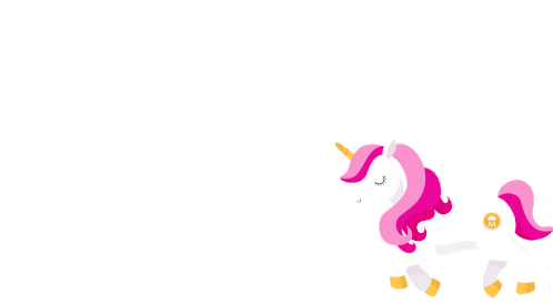 A cute white unicorn with a pink mane and tail, golden horn, and Misencil logo walks gracefully.