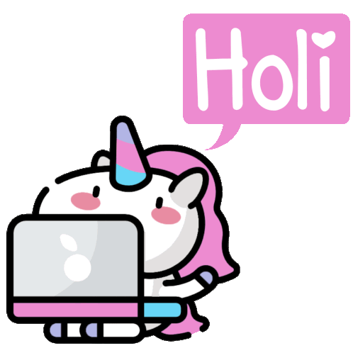 a unicorn is sitting at a desk with a laptop and a speech bubble that says holi