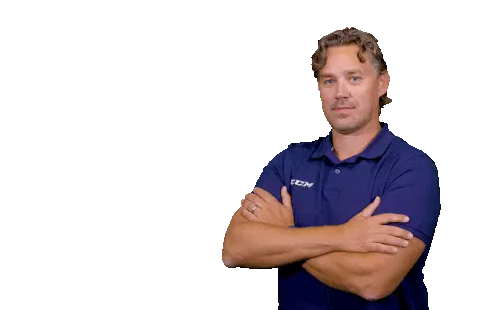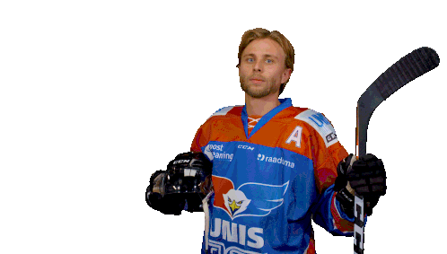 An ice hockey player from the Unis Flyers team, wearing a blue and orange jersey with an 'A' for alternate captain, holding a stick and glove.