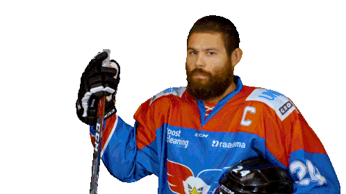 Ice hockey player Trevor from Unis Flyers, wearing a blue and red jersey with a 'C' and number 24, holding his stick and helmet.