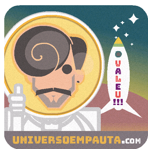 An astronaut and a rocket with "Valeu!!!" and "Universo Em Pauta.com" in a space-themed sticker.